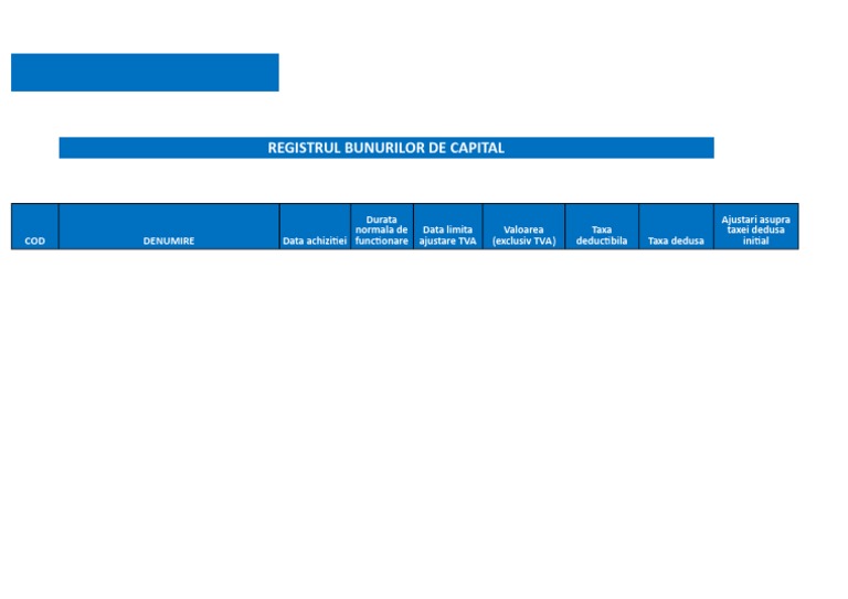 vizitati articolul complet aici : https://legestart.ro/analiza-fiscala-a-bunurilor-furate-distruse-sau-pierdute-din-punct-de-vedere-al-tva/ Bunurile de consum față de bunurile de capital există două tipuri de mărfuri, și bunuri de capital. Ajustare tva bunuri capital by pentruca in types > business/law. 2) valoarea bunului de capital exclusiv tva (baza de impozitare din factura furnizorului) nu se efectuează ajustarea taxei deductibile aferente bunurilor de capital, în situaţia în care suma care ar rezulta ca urmare a ajustării fiecărui bun de capital este mai mică de 1.000 lei.